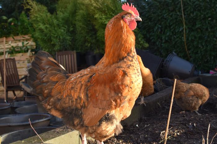 Hij is bij moeders (black copper Maran) in augustus uit het ei gekropen en met de rest van de kippen en vader opgegroeid.